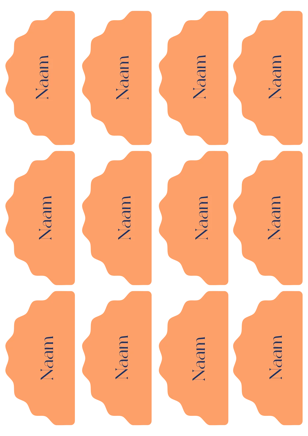 Prachtige naamkaartjes om de tafel helemaal af te maken. De kaartjes zijn in een halve boog met een mooie golvende rand. Passend bij de uitnodiging.