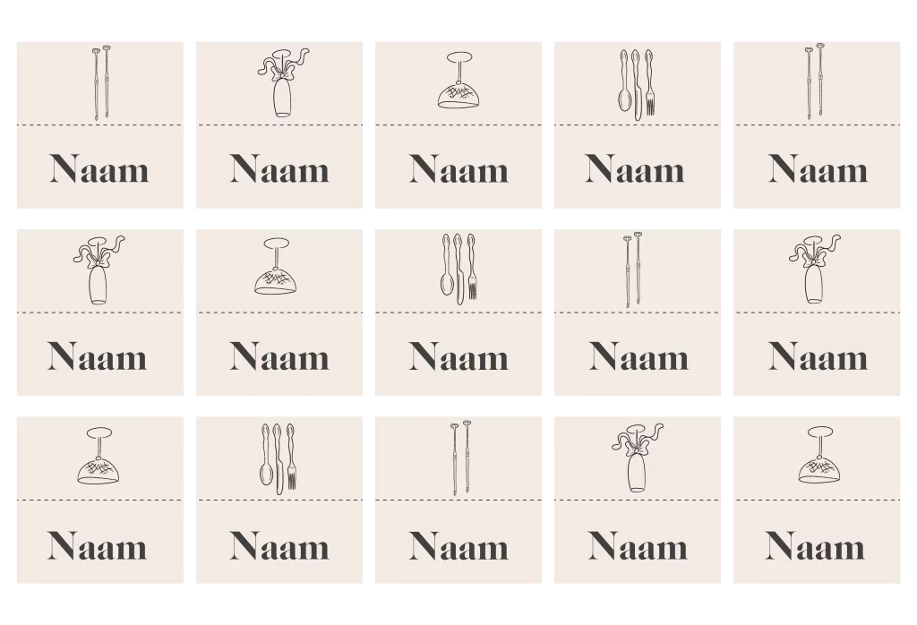 Mooie minimalistische naamkaartjes met fineline elementjes, uit de passende uitnodiging.