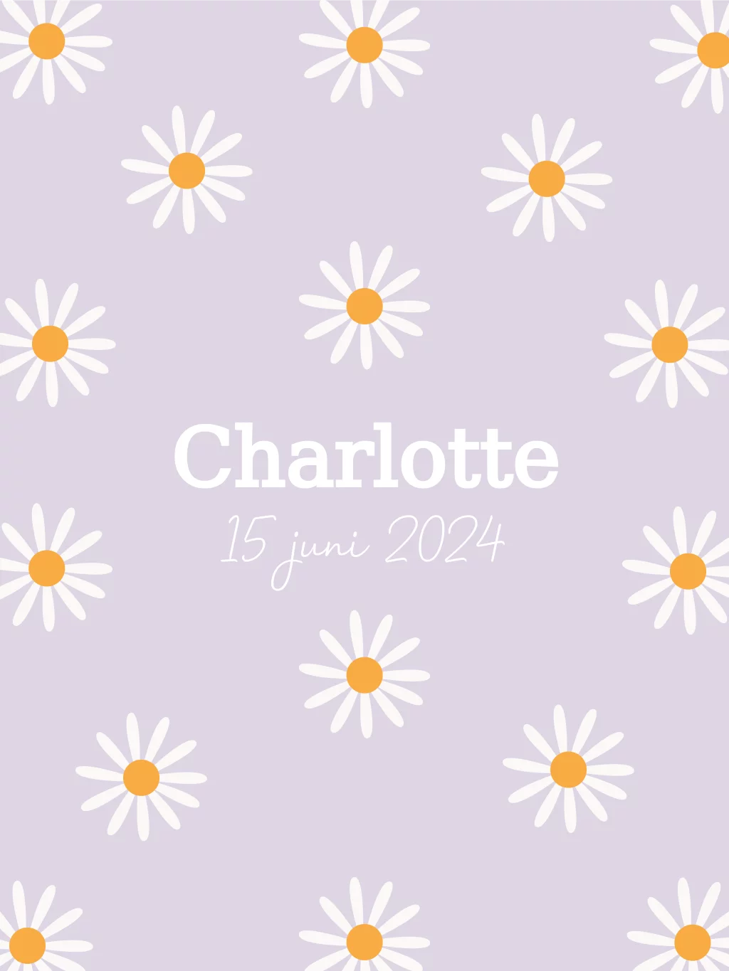 Prachtige minimalistische poster voor op een meisjeskamer met lila achtergrond en wit gele madeliefjes. De naam en geboortedatum maakt het helemaal af. Ook leuk om cadeau te geven.