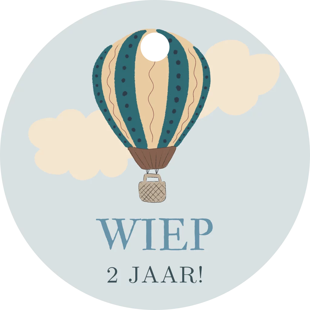 Label met lichtblauwe achtergrond en een illustratie van een luchtballon.