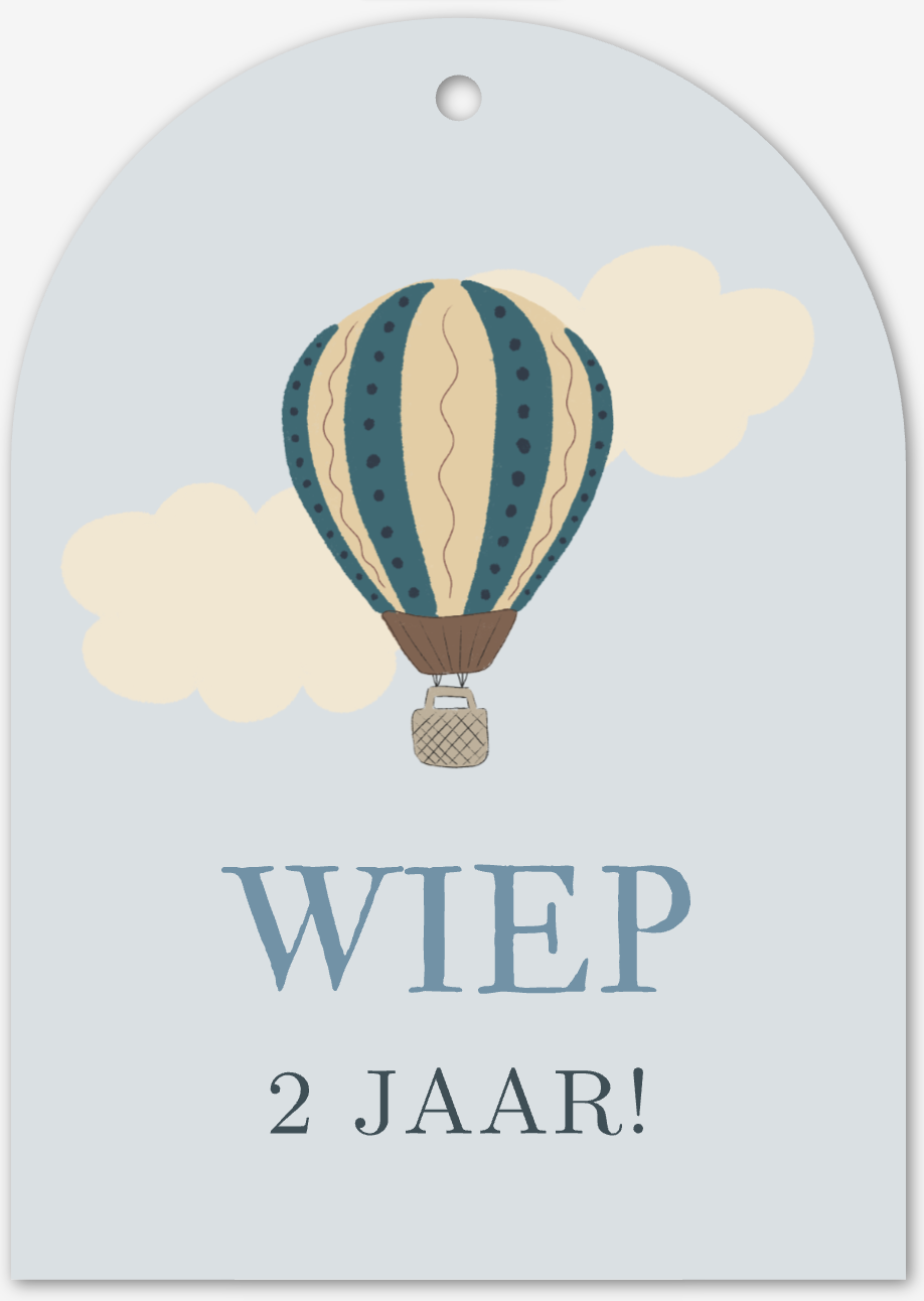 Tentkaartje in lichtblauw met een illustratie van een luchtballon erop.