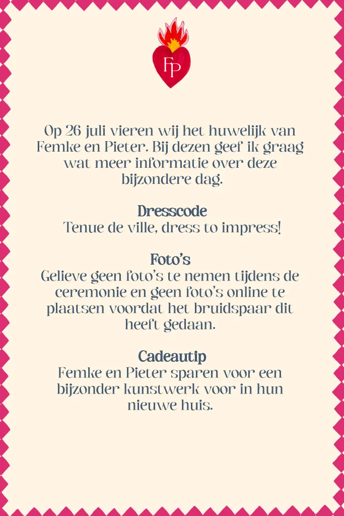 Ceremoniemeesterbrief in de huisstijl van de bruiloft Femke en Pieter. Op een ceremoniemeester brief kun je meer informatie en tips kwijt voor jullie gasten.