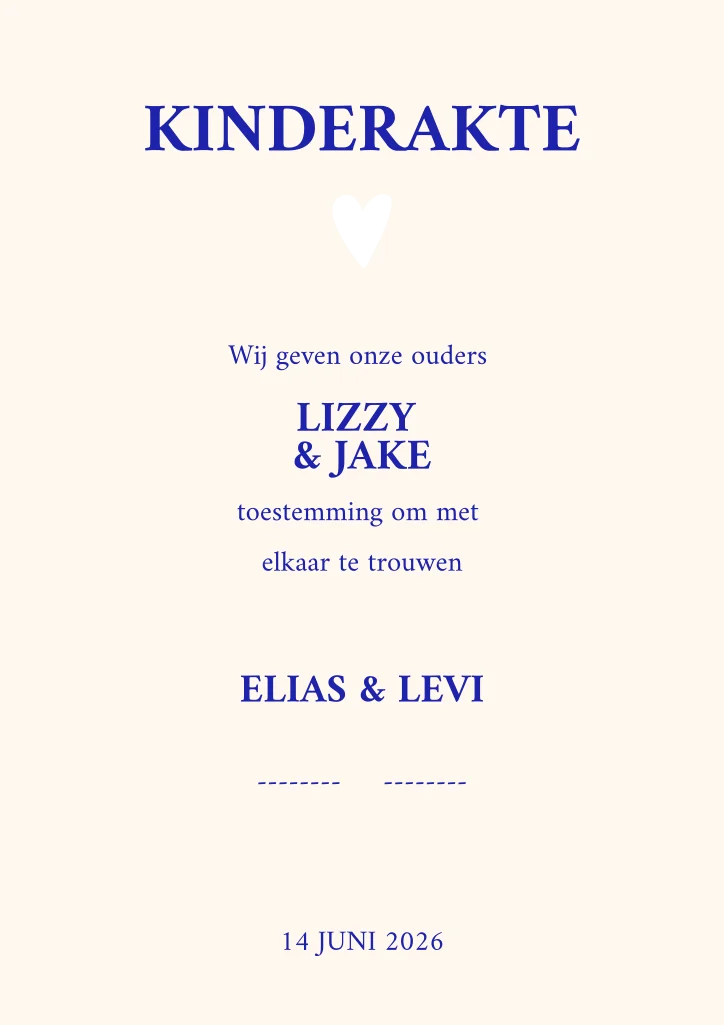 Willen jullie de kinderen ook echt een rol geven tijdens jullie speciale dag? Dan is deze kinderakte echt wat voor jullie! Deze kinderakte is helemaal opgemaakt in stijl van jullie uitnodiging. De tekst is natuurlijk naar jullie wens aan te passen.