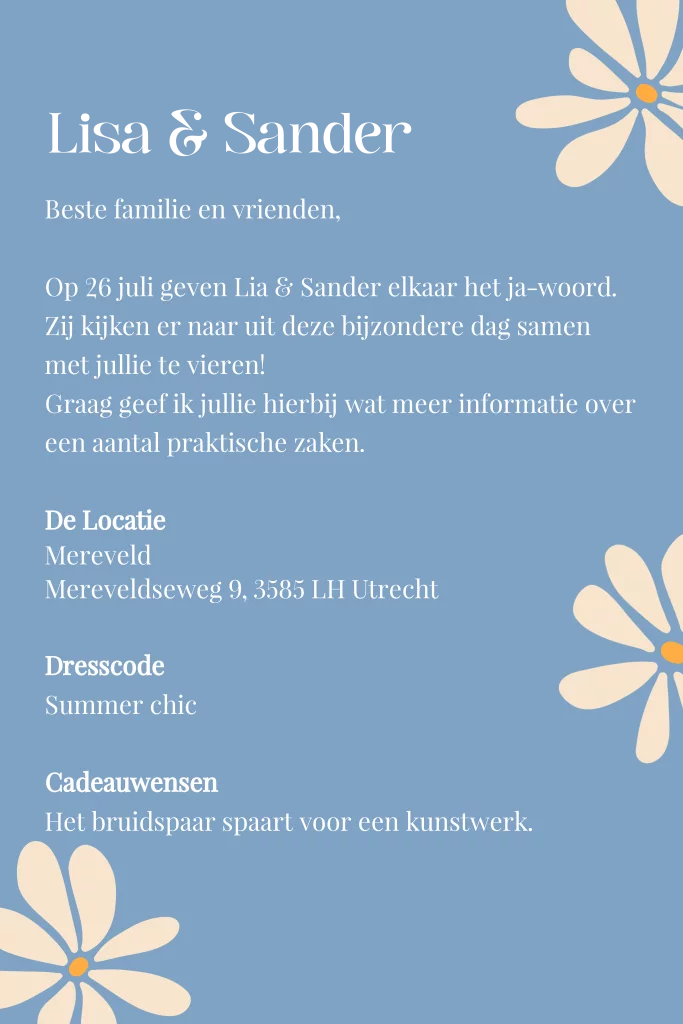 Hierop kun je meer details kwijt over bijvoorbeeld de locatie, parkeergelegenheid of overnachtingsmogelijkheden, de dresscode of cadeauwensen.