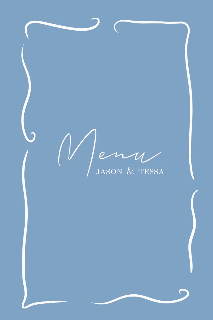 Mooie elegante menukaart in ijsblauwe kleur met kringelrandjes op de voorzijde om het geheel klassiek en uniek te maken.