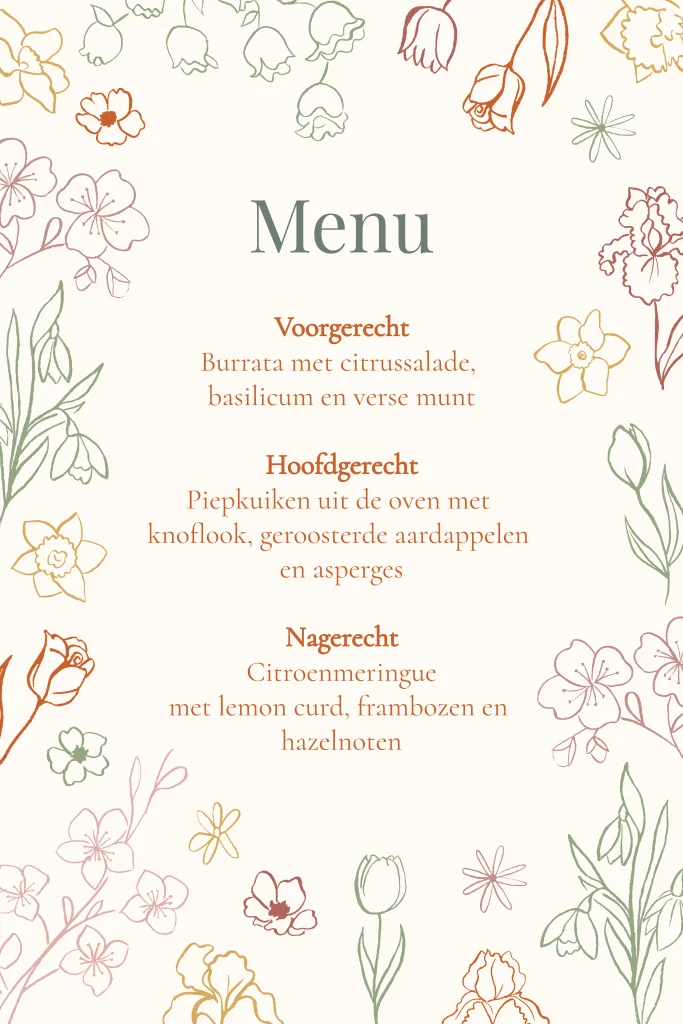 Maak je tafelsetting af met een mooie menukaart in stijl van je bruiloft! Deze menukaart heeft getekende bloemen, heel mooi voor een trouwerij in de lente of zomer.