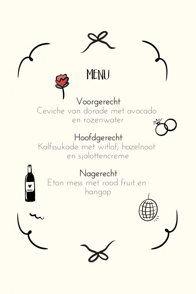 Een menukaart met vrolijke elementen en op de achterzijde de stijl van de trouwkaart.