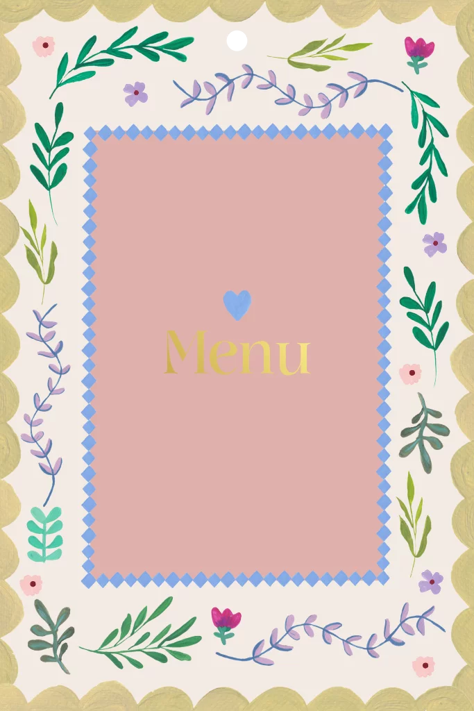 Prachtige menukaart met een rand met takjes en bloemetjes door ons geschilderd in gouache. Het goudfolie op de voorkant van de kaart maakt het helemaal af. Maak je tafelsetting af met deze mooie kaart!
