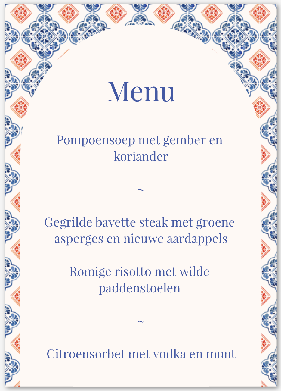 Mooie menukaart in tentvorm met een print van Spaanse tegels.