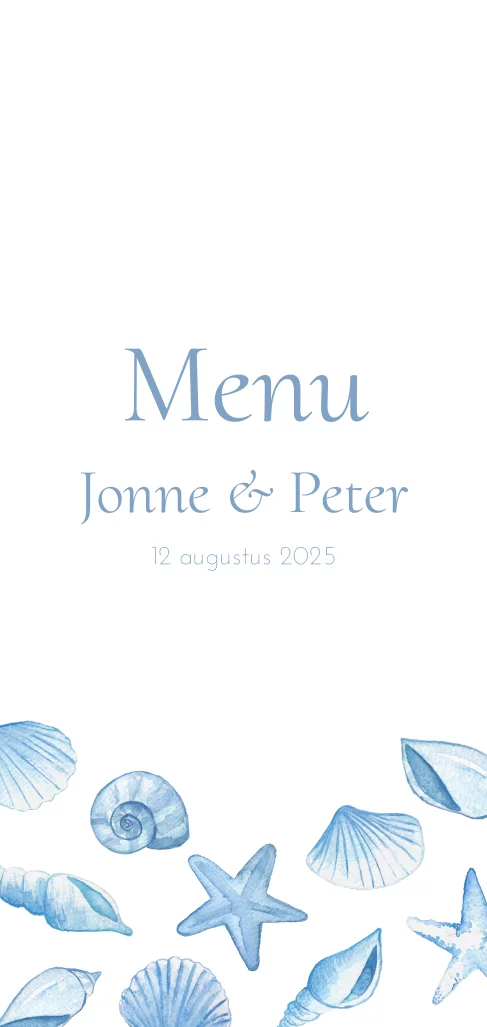 Vier je jouw bruiloft op het strand bij een leuk strandpaviljoen in de duinen? Dan is deze menukaart met schelpen iets voor jou!