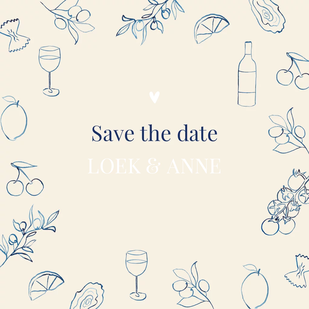 Prachtige unieke vierkante save the date kaart met op de voorkant in aquarel geschilderde elementen.