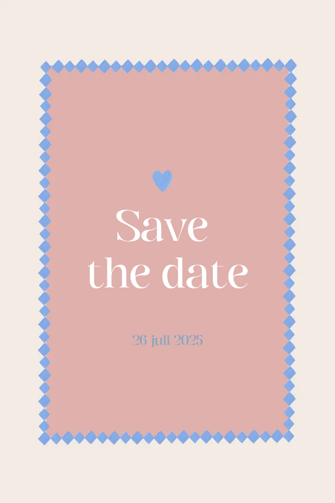 Unieke save the date kaart met een stijlvolle rand, door ons geschilderd in gouache. Deze kaart past perfect bij de uitnodiging, zonder direct het hele design prijs te geven!