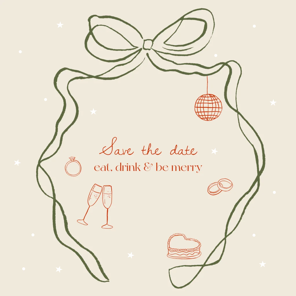 Deze save the date heeft een grote strik en andere geschilderde elementen. Pas alles eenvoudig aan in de editor.
