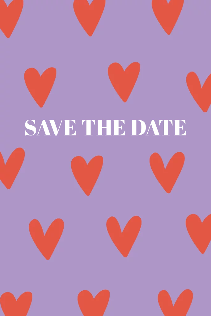 Vrolijke save the date kaart met paarse achtergrond en hartjes. Het goudfolie maakt het kaartje helemaal af.