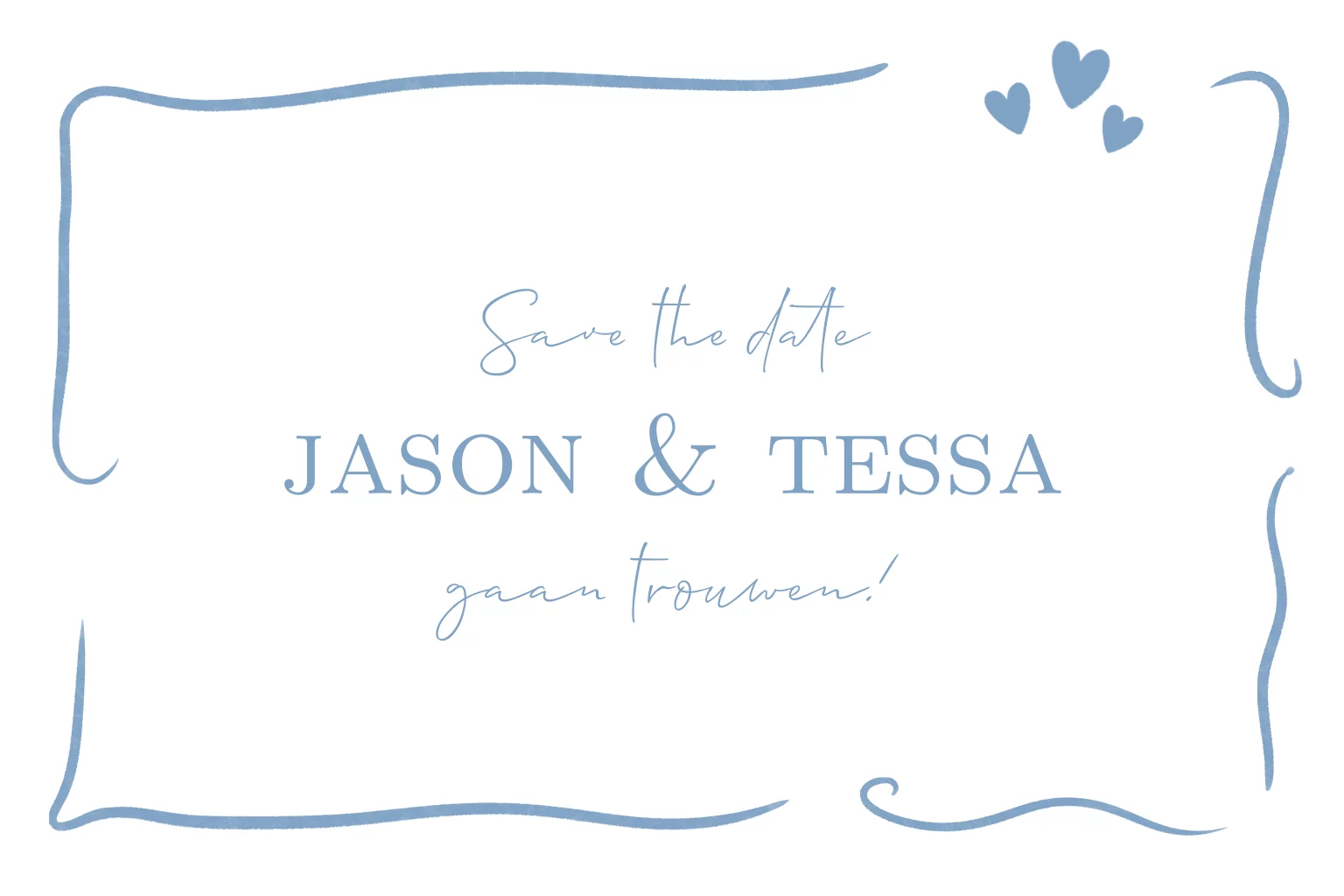 Op zoek naar een stijlvolle trouwkaart in de prachtige kleur blauw? Ontdek onze Trouw Save the date blauw rand, perfect voor elk seizoen. De bijzondere uitstraling van deze save the date wordt gecreëerd door de prachtig getekende randen, die een speelse maar klassieke sfeer uitstralen. De perfecte keuze voor koppels die op zoek zijn naar een trouwkaart met een vleugje romantiek en elegantie. De Trouw Save the date roze blauw rand is ideaal voor stellen die een klassieke en liefdevolle uitstraling willen voor hun trouwuitnodigingen