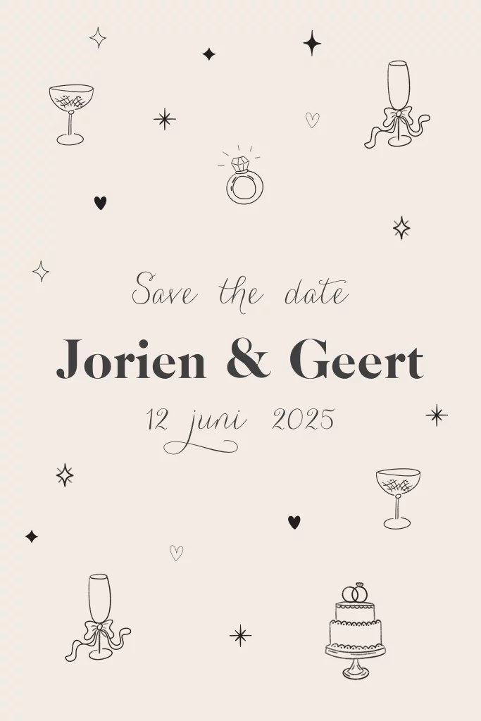 Op zoek naar een unieke en minimalistische aankondiging voor jullie huwelijk? Ontdek onze prachtige save the date kaart met fijne elementen. De subtiel getekende trouwelementjes geven de kaart een vrolijke, maar toch stijlvolle uitstraling. Perfect voor koppels die op zoek zijn naar een bijzondere aankondiging die de juiste toon zet voor hun speciale dag. De kaart is voorzien van hartvormige icoontjes en illustratieve elementen, en is uitgevoerd in een tijdloos zwart-wit ontwerp. Het minimalistische kleurenschema zorgt ervoor dat de kaart moeiteloos past bij elke trouwthema en bij iedere stijl. Of je nu kiest voor een klassieke, moderne of vintage bruiloft, deze save the date kaart past er perfect bij. Met de Trouw save the date fineline elementen kaart van Jorien&Geert geef je jullie gasten een voorproefje van jullie grote dag.