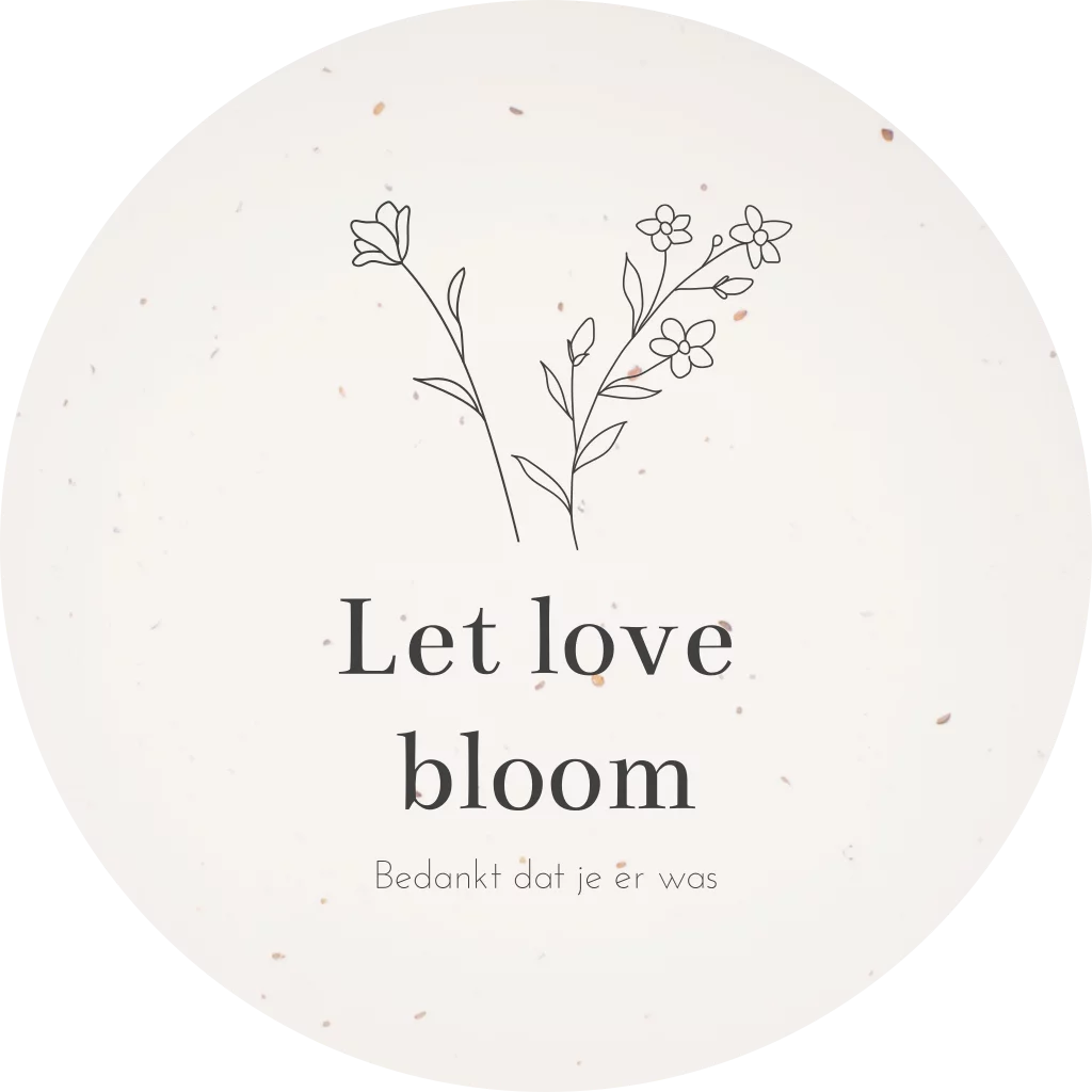 Sticker met bloemen en "Let love bloom" in een mooi minimalistisch design. Plak deze sticker op een zakje zaadjes of een ander cadeautje om je gasten te bedanken op je bruiloft!