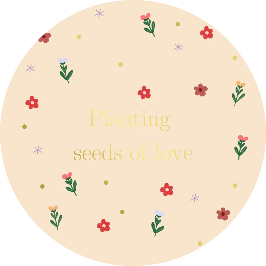 Sticker met bloemen en "Planting seeds of love" in een mooi design met bloemen. Het goudfolie maakt deze sticker extra speciaal!