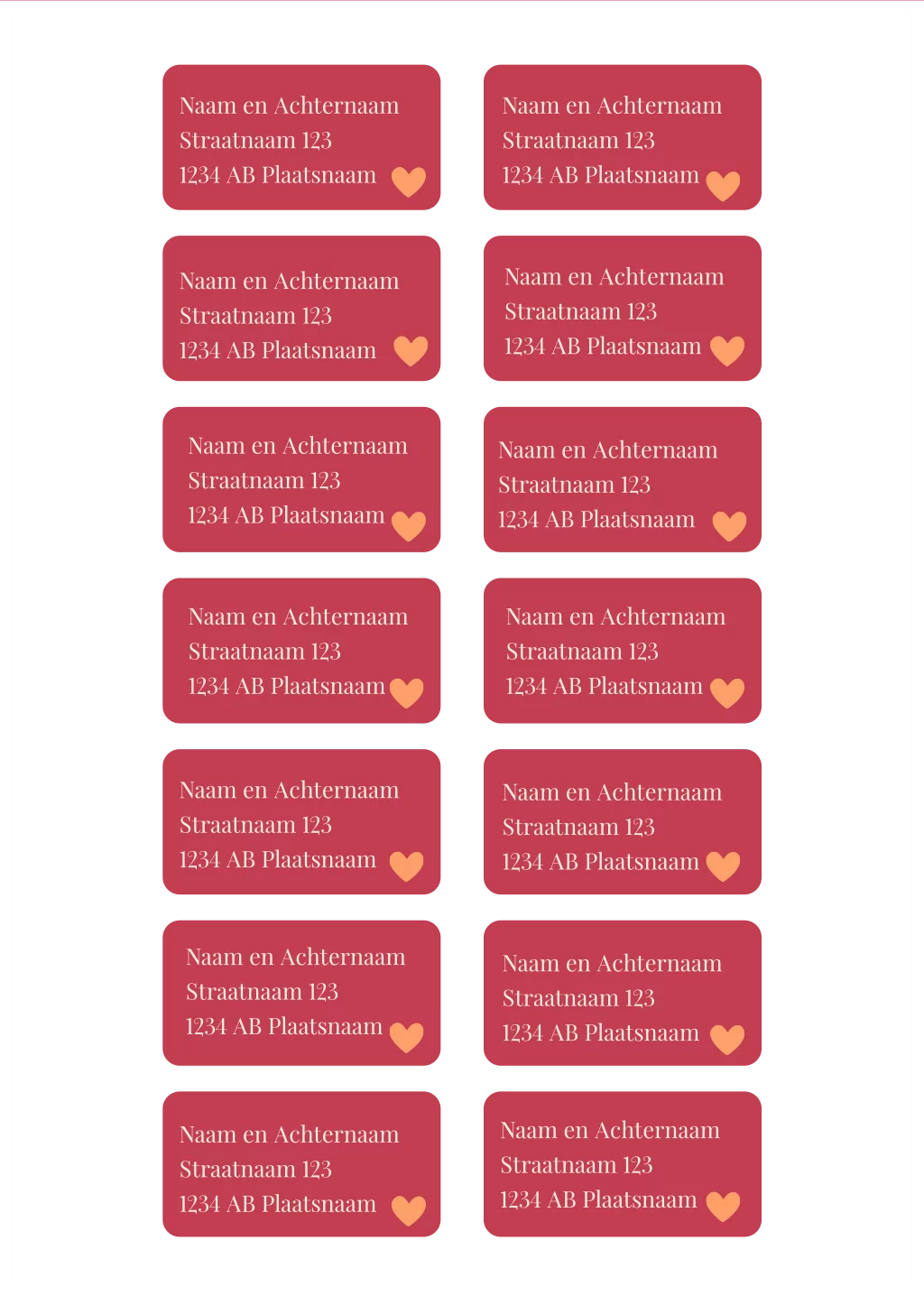 Mooie rode adresstickers met een subtiel oranje hartje, die goed passen bij de rest van de collectie in deze trouwhuisstijl.