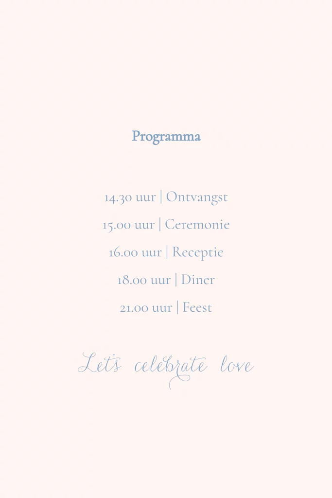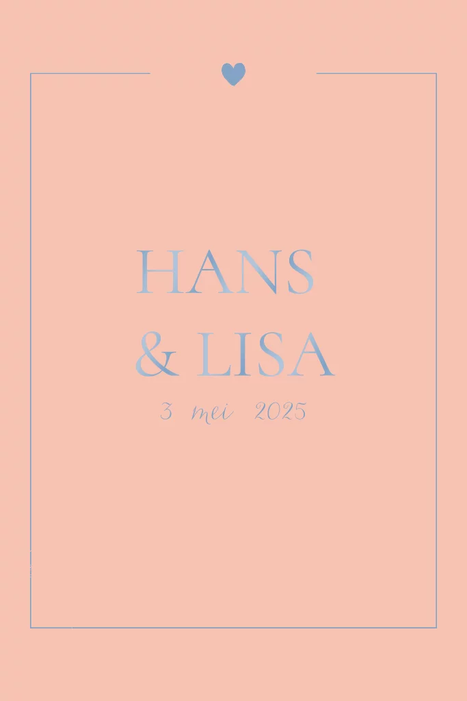 Op zoek naar een unieke trouwuitnodiging die zowel minimalistisch als speciaal is? Ontdek onze prachtige uitnodiging in perzikkleur met een vleugje blauw. De voorzijde is voorzien van een hoogglansafwerking, wat een extra dimensie toevoegt aan de elegante typografie. Met zijn rustige en romantische uitstraling is deze uitnodiging perfect voor stellen die op zoek zijn naar een klassieke en toch eigentijdse uitnodiging.