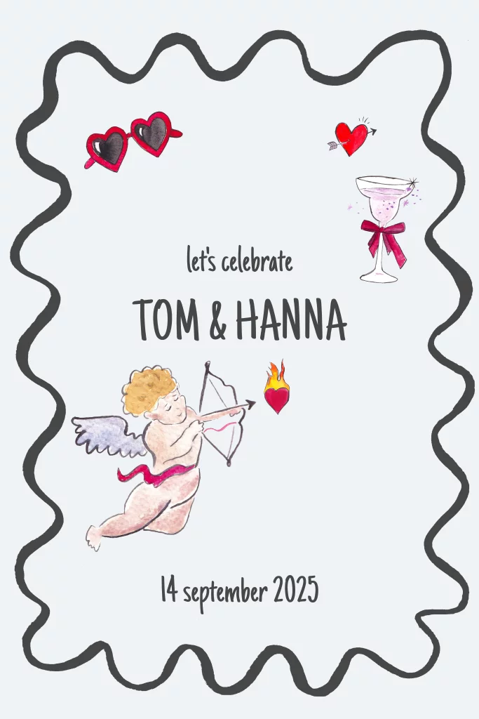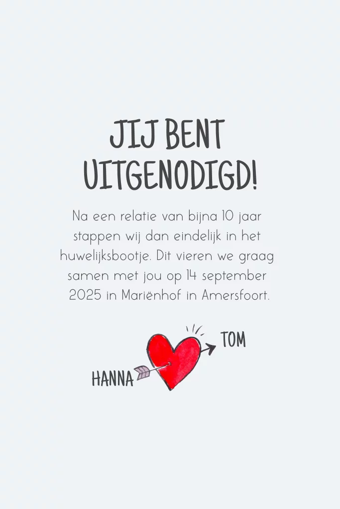 Unieke trouwkaart met leuke liefdes tekeningen op een lichtblauwe achtergrond. De 'doodles' zijn door ons geschilderd in aquarel.
