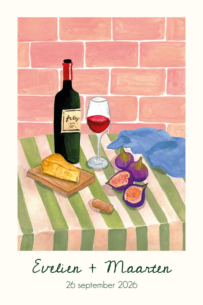 Unieke trouwkaart met een geschilderde tafel met wijn, kaas en vijgen erop. Perfect voor bruidsparen die van lekker eten houden!