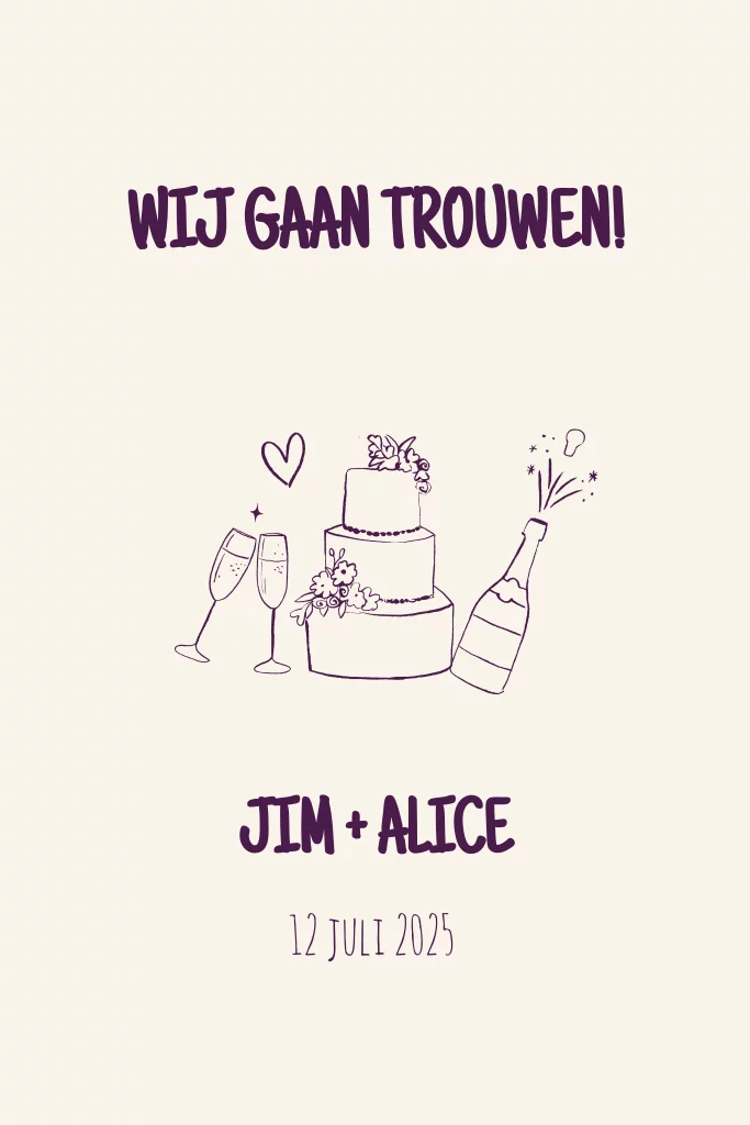 Minimalistische hippe trouwuitnodiging met geschilderde elementen. De achtergrond is donkerpaars en beige. De elementen zijn door ons geschilderd, dit ontwerp vind je nergens anders!