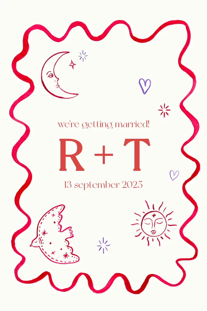 Deze trouwkaart heeft een handgeschilderde kringelrand en trendy elementen zoals een maan, zon, sterren en een zwaluw. Deze elementen zijn door ons geschilderd en dus volledig uniek!