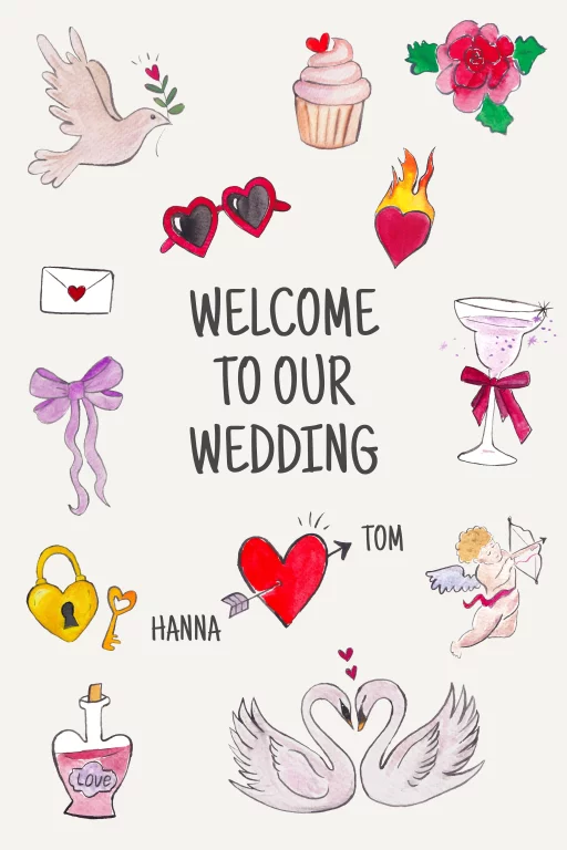 Hip welkomstbord met leuke liefdes tekeningen. De 'doodles' zijn door ons geschilderd in aquarel.