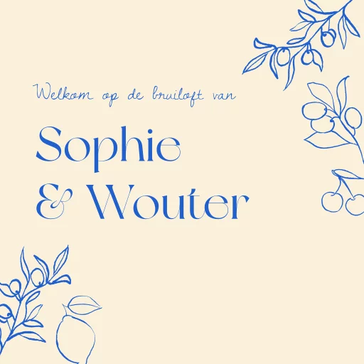 Bruiloftsbord in 70x70cm maat, passend bij de gehele lijn met aquarel mediterraans geschilderde elementen.