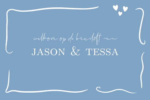 Prachtig welkomstbord voor jouw bruiloft in ijsblauwe kleur met witte getekende randjes en hartjes.