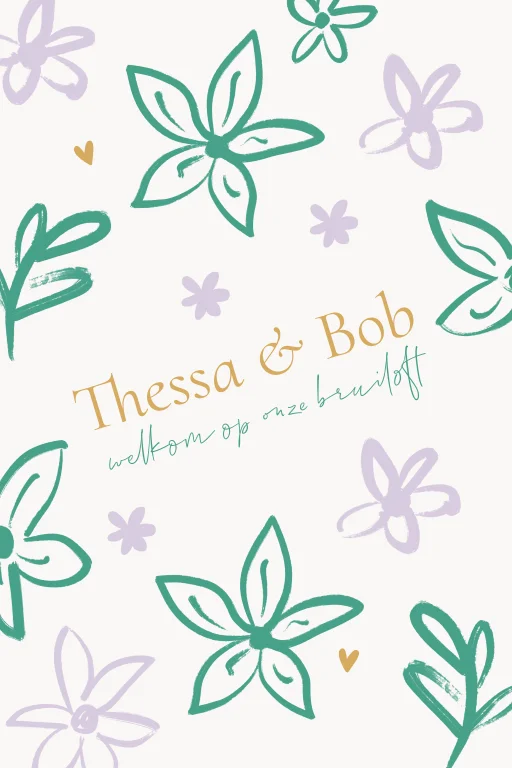 Passend bij de rest van de stijl; een prachtig welkomstbord met bloemenpatroon in paars en groen om jouw gasten welkom te heten op jouw prachtige dag.