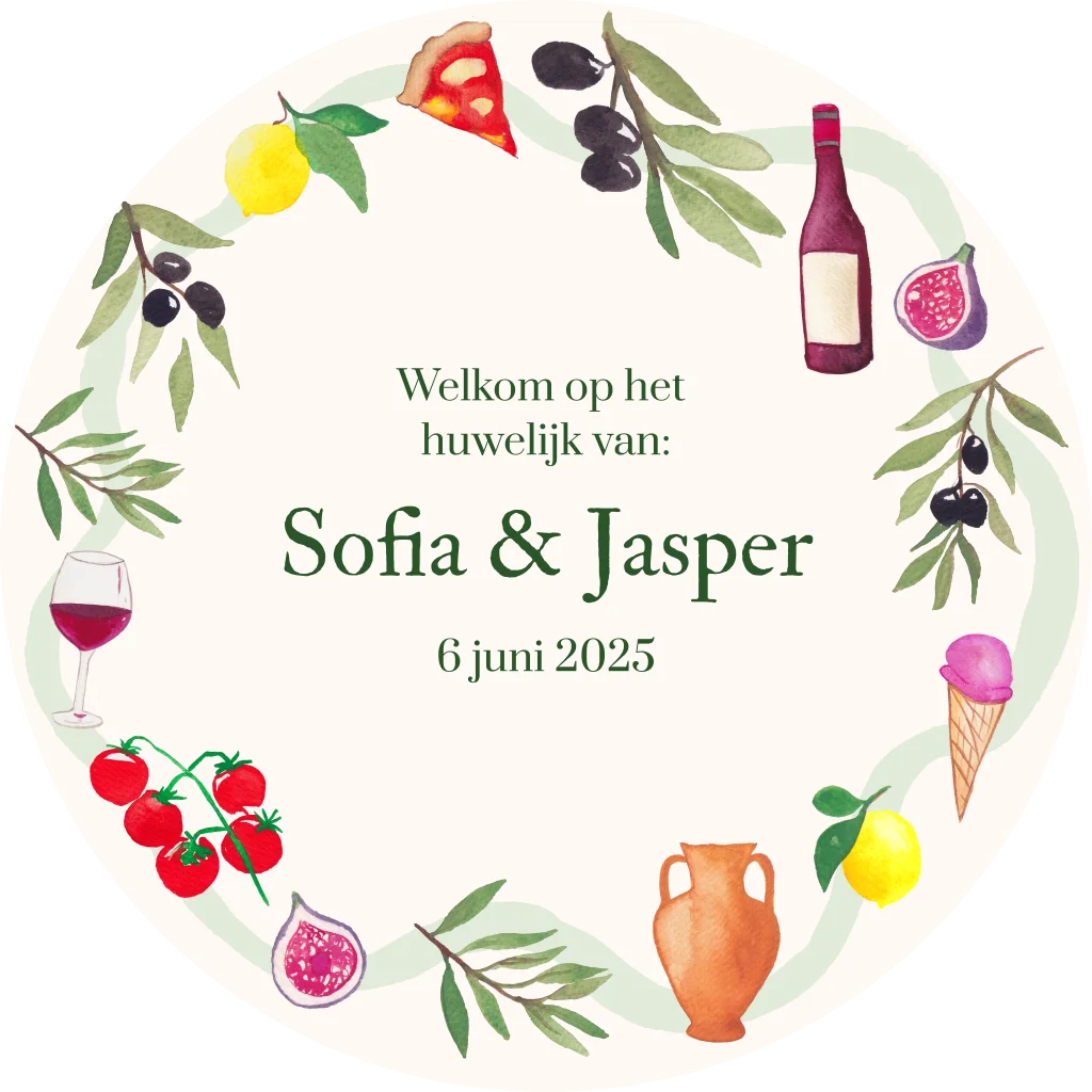 Prachtig welkomstbord voor je bruiloft met Italië elementen, door ons geschilderd.