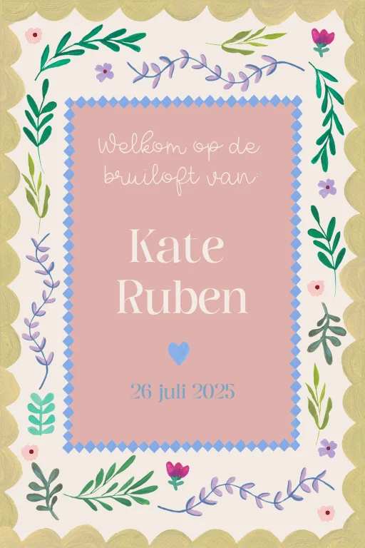 Prachtig welkomstbord in de stijl van de uitnodiging in de lijn Kate & Ruben.