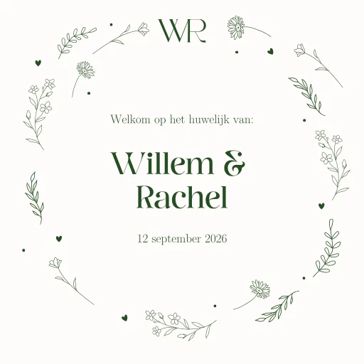 Prachtig welkomstbord voor je bruiloft met een krans van bloemen en takjes
