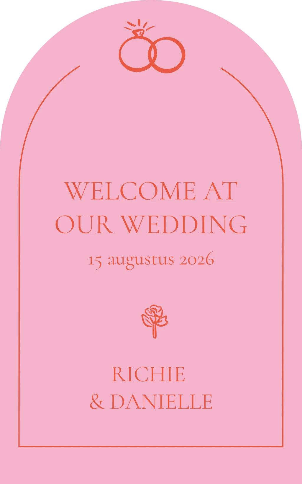 Mooi welkomstbord in een boogvorm met roze en rood. Het kleurrijke bord geeft meteen een mooie romantische sfeer voor het aanstaande huwelijksfeest!
