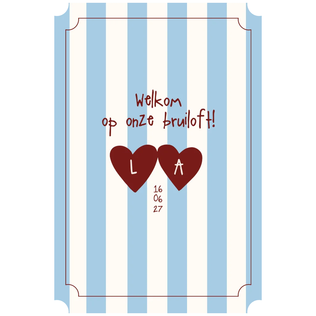 De kaart is blauw gestreept, creme & bordeaux rood.