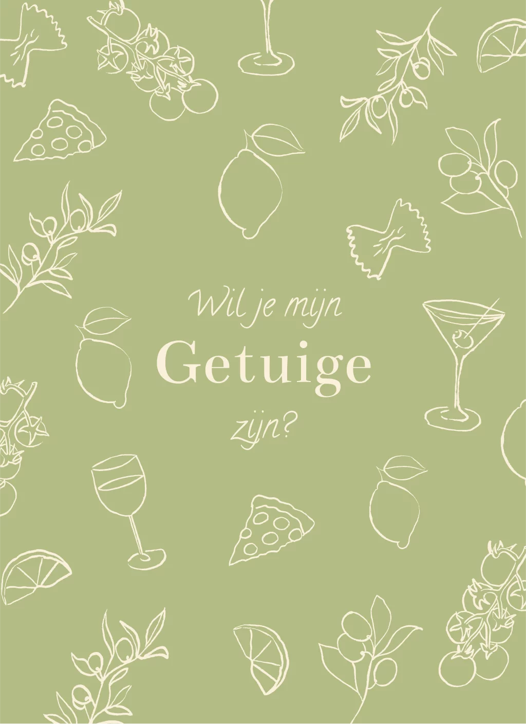 Een mooi wijnetiket met geschilderde elementen op een olijfgroene achtergrond. Het etiket is 80 x 110mm en plak je eenvoudig op een fles wijn. Een originele manier om iemand als getuige of ceremoniemeester te vragen!