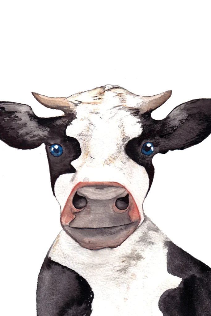 Kaart van een koe, door ons geschilderd met waterverf. Deze kaart is top als kraamcadeau of voor een kind dat gek is op boerderijdieren.