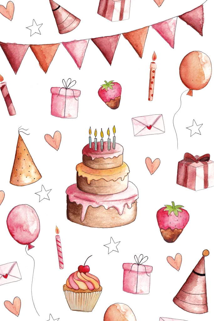 Gezellige verjaardagskaart, met illustraties van balonnen, slingers, taart en meer. Leuk om op te sturen naar een jarige of om te geven bij je cadeautje.
